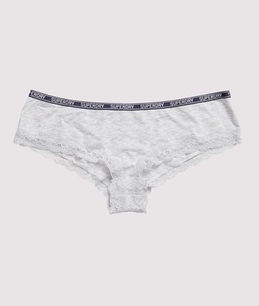Superdry triopak Lola Lace-damesslips. Een verpakking met drie slips voorzien van een elastische tailleband en afgezet met kanten details. De slips zijn afgewerkt met een Superdry-tekst op de tailleband.