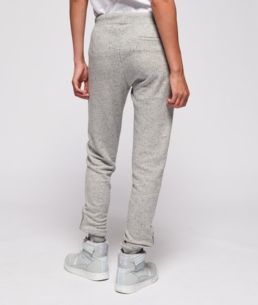 Superdry Fashion-damesjoggingbroek met rits. Deze strakke joggingbroek met enkelboorden heeft een elastisch trekkoord in de taille, twee voorzakken en ritsen langs de enkels. Deze broek heeft ook een verweerde look en is afgewerkt met een Superdry-label op de tailleband.