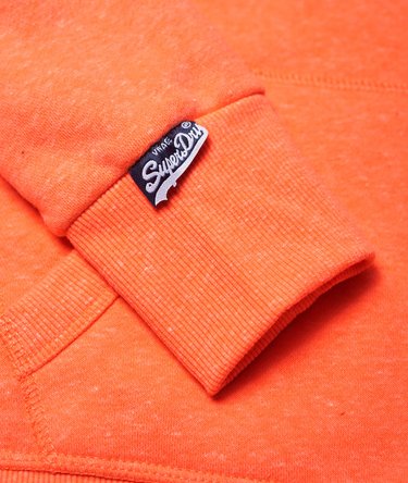 Superdry Genuine-dameshoodie. Een klassieke hoodie voor over het hoofd met capuchon met trekkoord, een gebarsten Superdry-Logo op de borst en een buidelzak. De Genuine-hoodie heeft ook geribde boorden en een logolabel in de mouwboord. De hoodie is afgewerkt met het kenmerkende oranje stiksel in de zijnaad.