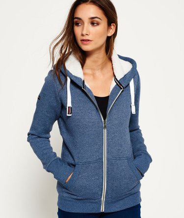 Superdry Luxe Sherpa dameshoodie met rits uit de Orange Label reeks. De klassieke Superdry hoodie met een rits, een capuchon met trekkoord en twee voorzakken. De hoodie heeft een knusse sherpa voering in de romp en capuchon en is afgewerkt met een Superdry Orange Label Luxe logolabel op de zoom en mouw.
