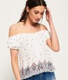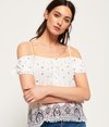 Superdry Peekaboo geborduurde damestop. Deze top met van de schouders afhangende mouwen heeft verstelbare spaghettibandjes, een knoopsluiting aan de voorkant en een geborduurd ontwerp op de zoom. De Peekaboo-top is afgewerkt met een subtiele metalen logobadge boven de zoom en past perfect bij een denim short.